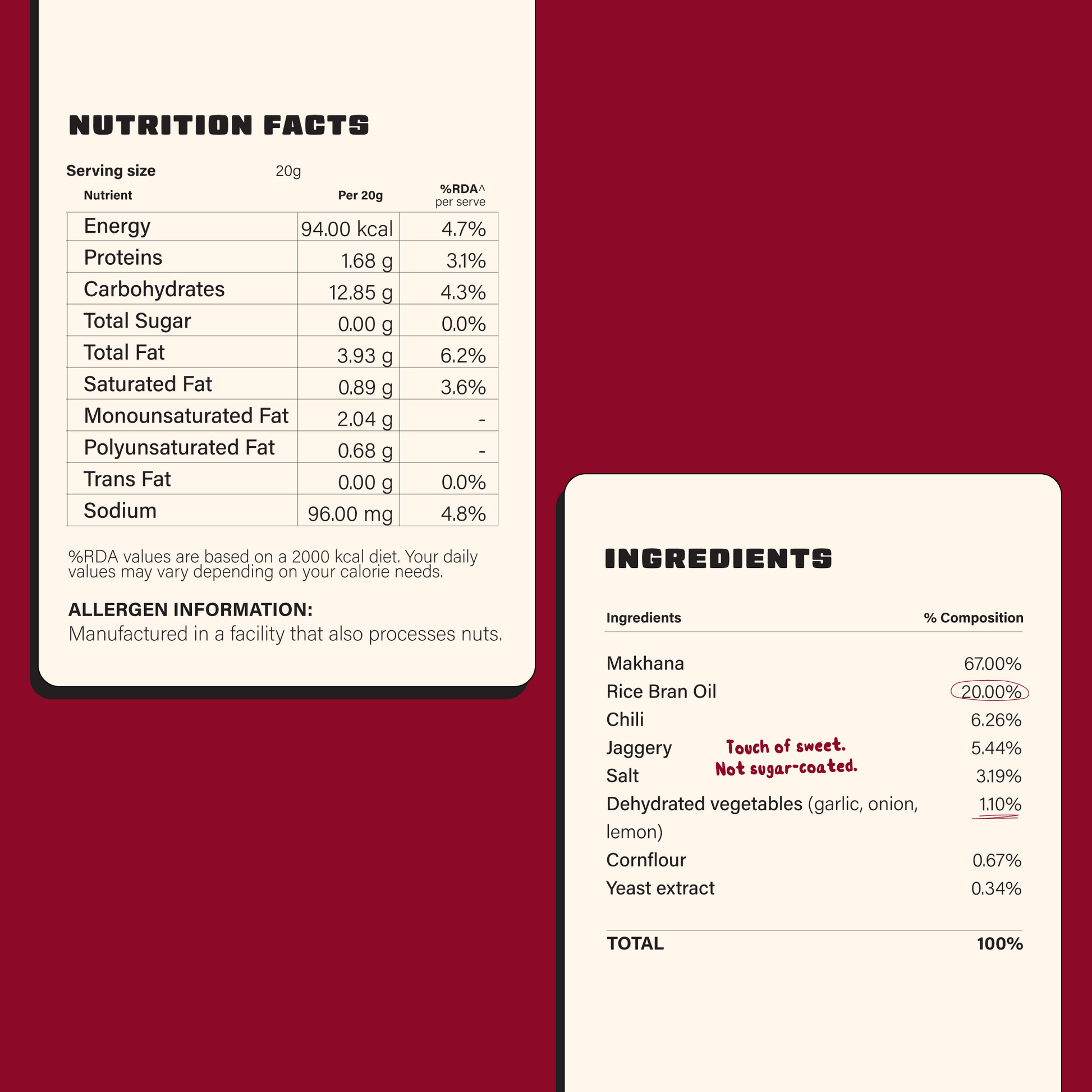 Makhana (67%), Rice Bran Oil (20%), Chili (6.26%), Jaggery (5.44%), Salt (3.19%), Dehydrated Vegetables [Garlic, Onion, Lemon] (1.10%), Cornflour (0.67%), Yeast Extract (0.34%).