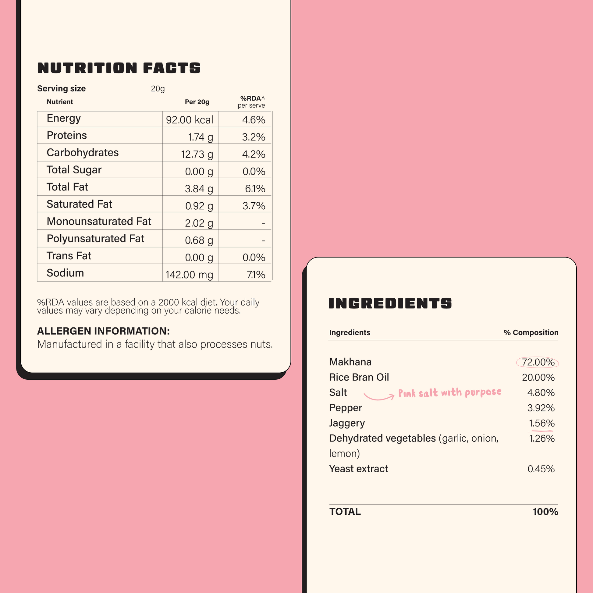Makhana (72%), Rice Bran Oil (20%), Salt (4.80%), Pepper (3.92%), Jaggery (1.56%), Dehydrated Vegetables [Garlic, Onion, Lemon] (1.26%), Yeast Extract (0.45%).