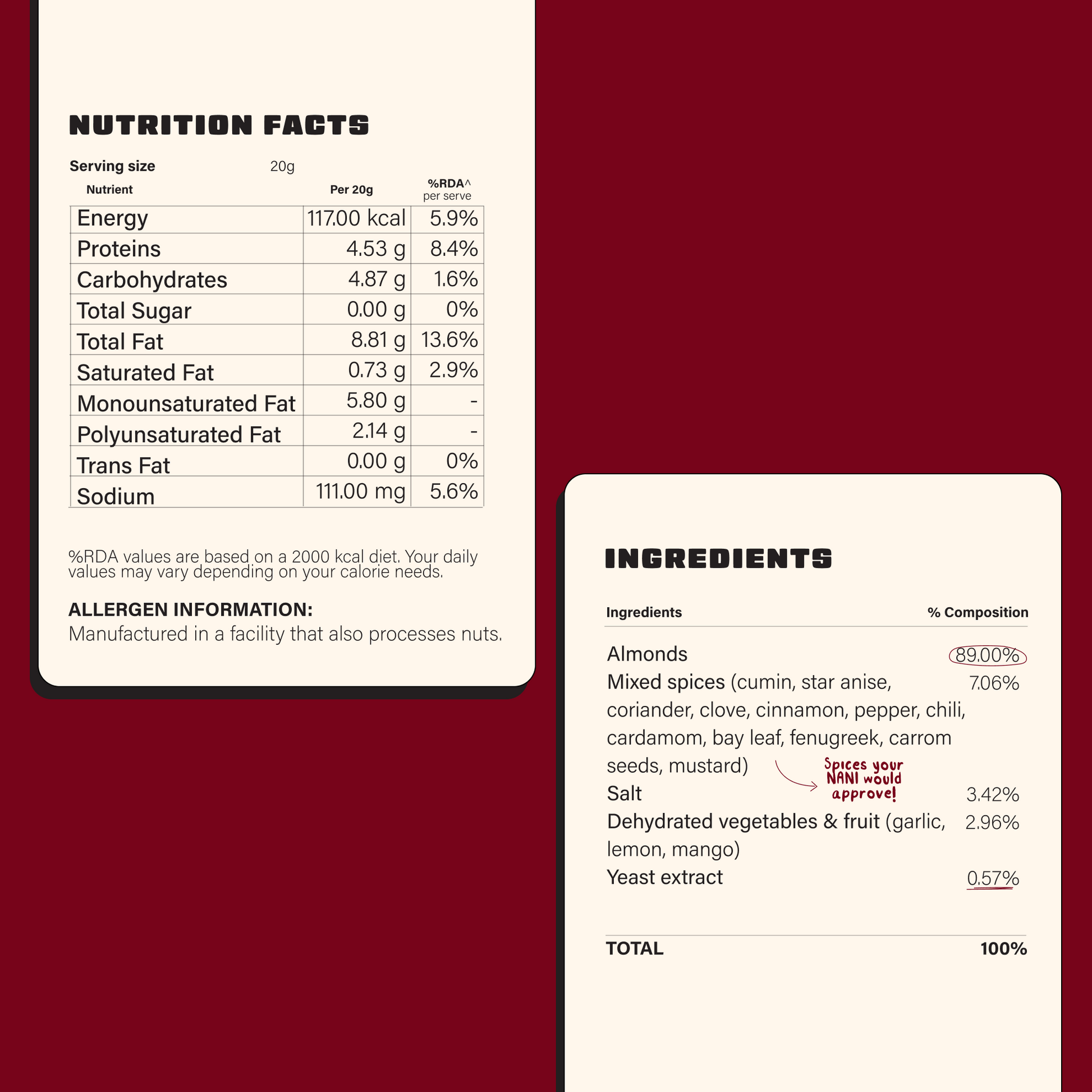 Almonds (89%), Mixed Spices [Cumin, Star Anise, Coriander, Clove, Cinnamon, Pepper, Chili, Cardamom, Bay Leaf, Fenugreek, Carrom Seeds, Mustard] (7.06%), Salt (3.42%), Dehydrated Vegetables & Fruit [Garlic, Lemon, Mango] (2.96%), Yeast Extract (0.57%).