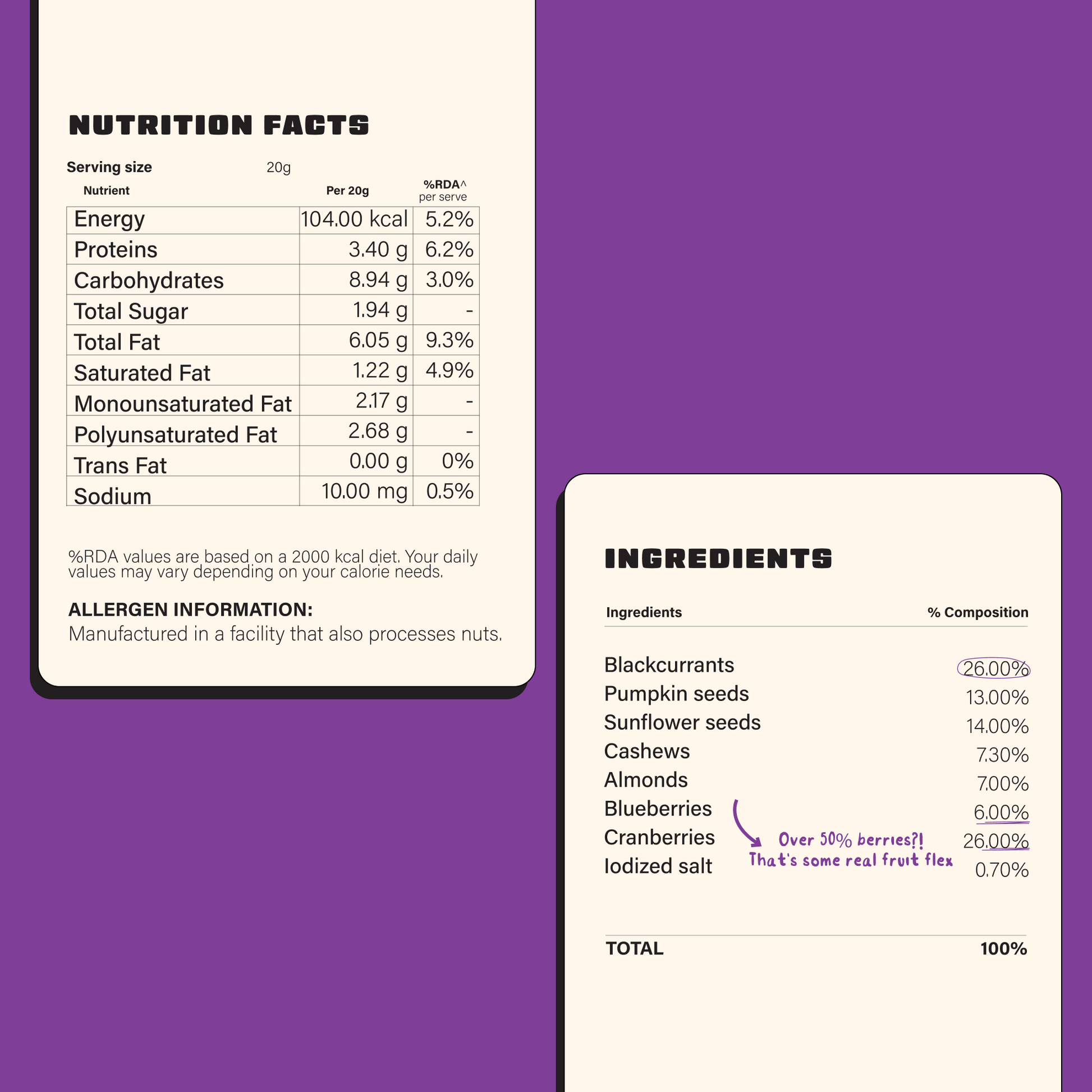 Blackcurrants (26%), Cranberries (26%), Sunflower Seeds (14%), Pumpkin Seeds (13%), Cashews (7.3%), Almonds (7%), Blueberries (6%), Iodized Salt (0.7%).